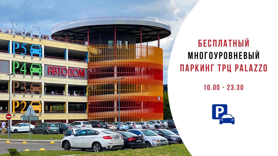 Дорогие посетители, напоминаем, что в ТРЦ Palazzo бесплатный крытый 6-ти уровневый паркинг, который соединен с ТРЦ и имеет крытые переходы. Вы с комфортом попадете в здание нашего торгово-развлекательного центра.