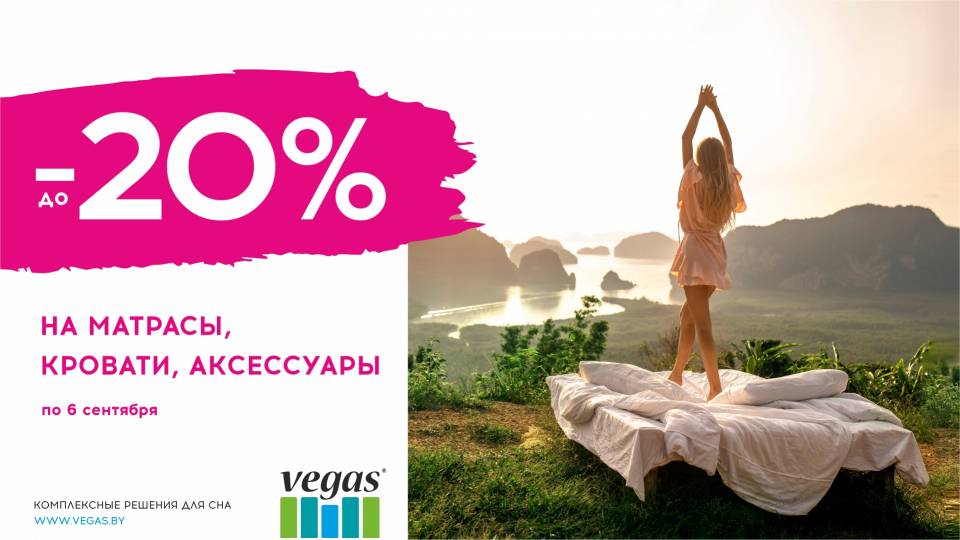 Только по 6 сентября в салонах товаров для сна Vegas вас ждут скидки до 20% на матрасы, кровати и аксессуары, чтобы выспаться мог каждый!