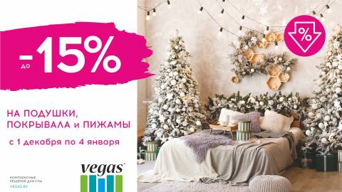 Вас ждет теплая и уютная зима, ведь по 4 января бренд товаров для сна Vegas дарит скидки до 15% на подушки, покрывала и пижамы.