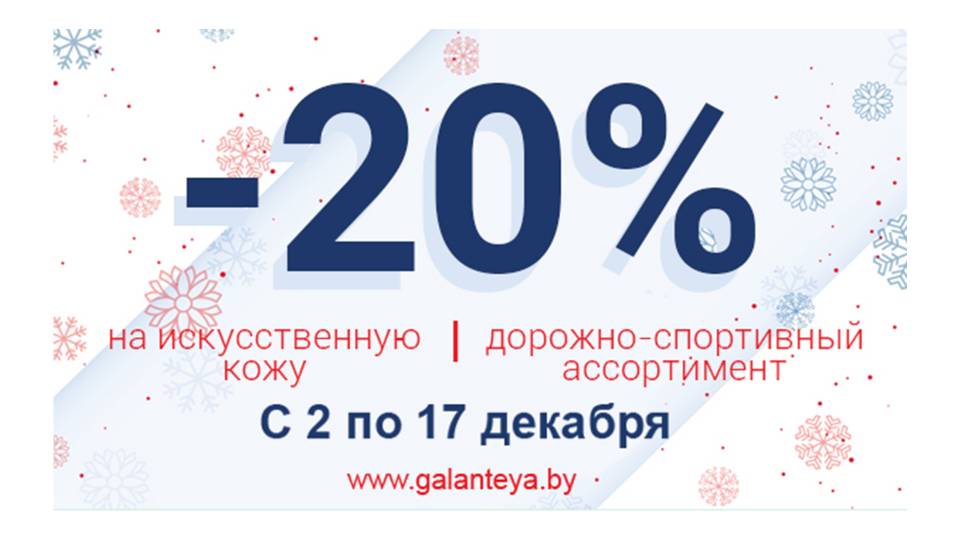 C 2 по 17 декабря в GALANTEYA действует скидка в размере 20% на кожгалантерейные изделия из искусственной кожи и на дорожно-спортивный ассортимент.